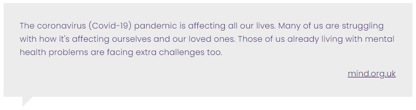 If you are concerned about your own mental health and well-being, you can read more about how to access further advice and support by clicking here to visit Mind’s website.